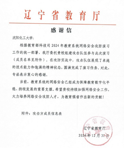 在教育部科技司组织的2024年教育系统网络安全攻防演习中,公司3044永利集团经理王军教授网络安全团队受辽宁省教育厅委托参加此次演习。在攻防实战中,团队展现了卓越的技术能力和饱满的精神状态,圆满完成了演习任务,并收到了辽宁省教育厅的感谢信。