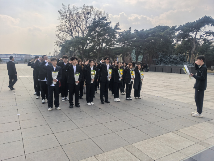 在抗美援朝烈士陵园,全体师生肃立于“抗美援朝烈士英灵永垂不朽”纪念碑前默哀致敬,铿锵地重温入团誓词。随后,员工代表马婧怡在邱少云烈士墓前动情讲述其烈火焚身仍岿然不动的壮烈事迹;员工代表李光耀讲述赵铁柱烈士以身躯堵枪口用生命开辟冲锋道路的英勇事迹。同学们手捧白菊献于墓前,凝视烈士纪念墙上密布的名字,聆听无声的历史回响,深刻体悟英雄用生命铸就的精神丰碑。